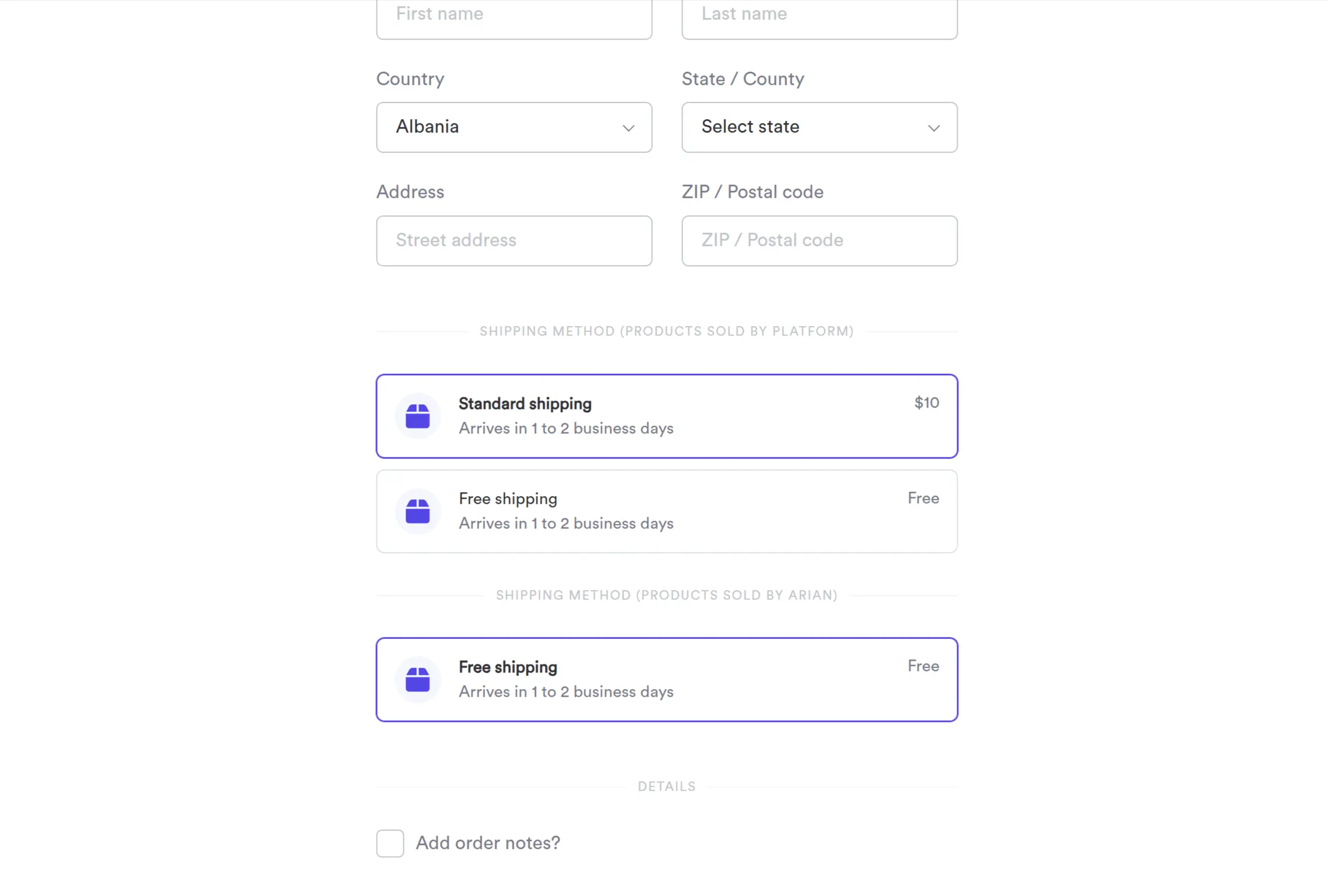 However, different vendors provide different shipping rates and deliver to different zones. In such scenario, products are categorized by seller, and customer has to select rate for each group of products.