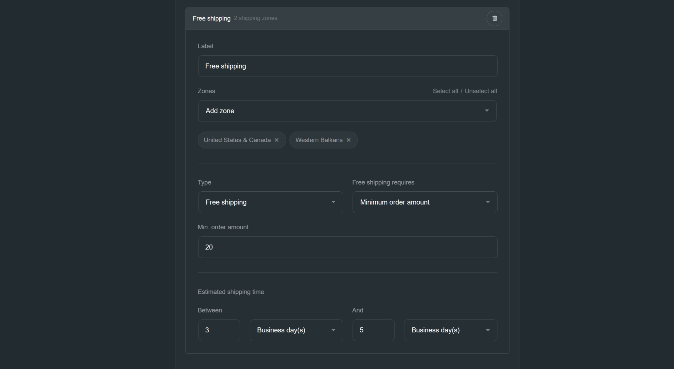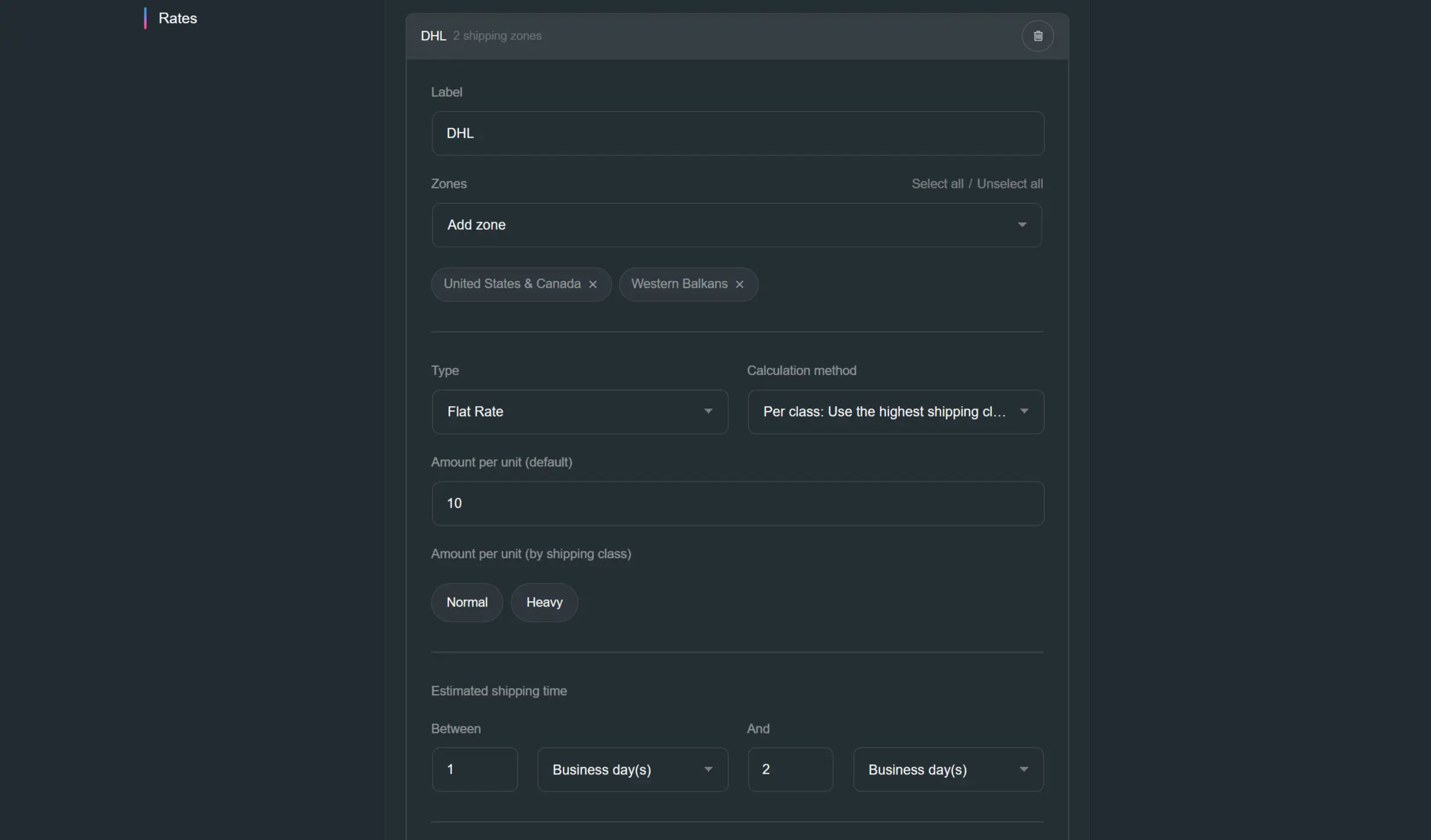- Shipping zones that this rate is available in
